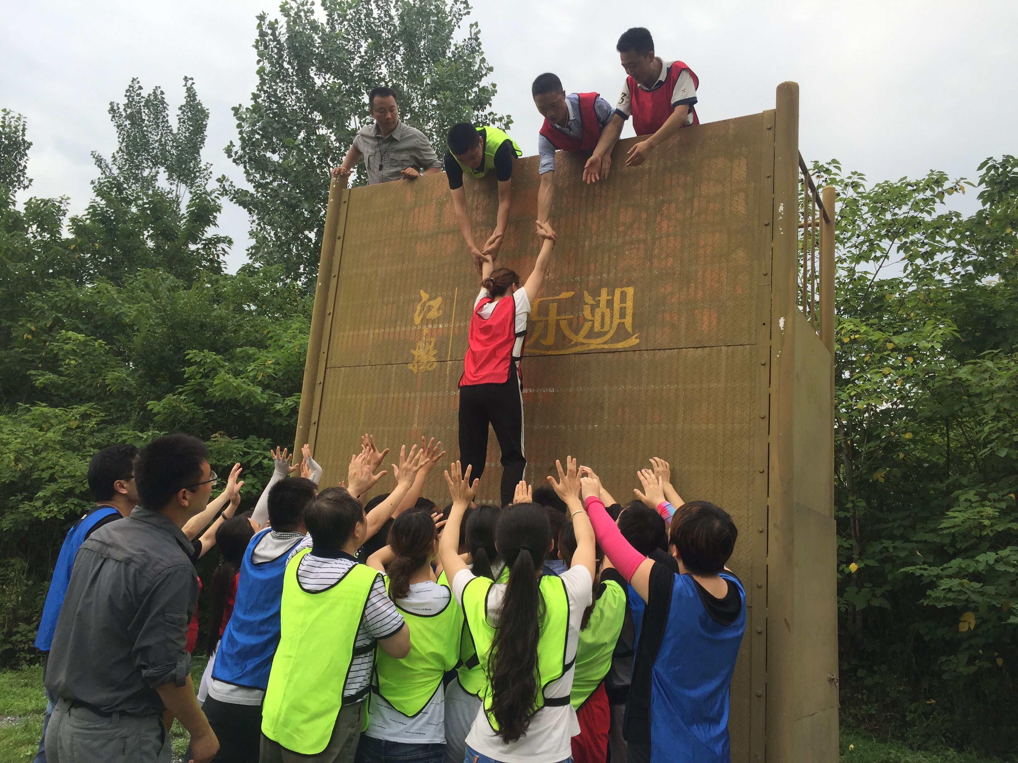 拓展培训过程中,大家在培训老师的带领下被分成三个小组,经过各小组的一番头脑风暴,一个个响亮的团队口号和富有特点的团队LOGO逐一精彩亮相,“飞鹰队”“银河队”、“搏击队”个性鲜明、充满力量的团队形象拉开了体验式拓展的序幕。之后3个小队的成员们分别参与到“不倒森林”“珠行千里”“同心击鼓”“急速60秒”“呼吸的力量”“挑战第一”等经典管理学培训项目中,一个个精心设计的拓展项目激发了大家浓厚的参与兴趣与热情。在交叉进行的拓展体验过程中,团队成员们在共同的配合下,攻克了一个个曾经认为不可能完成的项目,每个项目结束后大家共同分享了成功的喜悦和挑战的激情,充分地体会到了团队信任、有效沟通、换位思考、合理组织、领导力、执行力和团队协作等和工作息息相关的管理意识和艺术。活动过程中,大家积极参与,迎难而上,大胆挑战自我,队员之间相互加油,相互鼓励,克服心理障碍,不逃避不放弃,所有团队均圆满完成了各拓展项目的培训。最后所有团队在“毕业墙”下会师,集合所有成员的力量挑战毕业墙,垫底、托举、保护,通过集体的智慧,集体的力量,全体队员顺利通过,欢呼声、掌声留在毕业墙下,定格在画面里,也深深地刻在每个队员的记忆中。